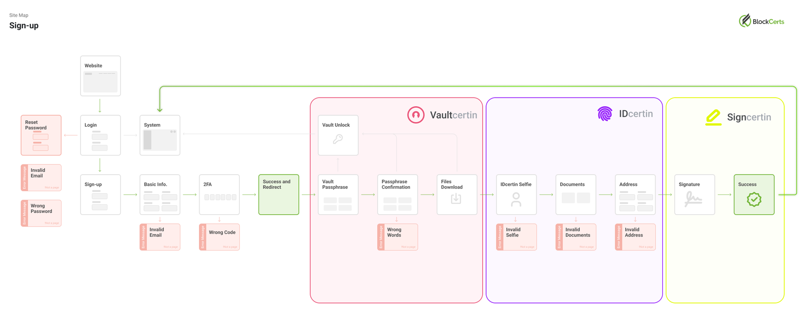 Then, based on the User Journeys, I start creating the site map to understand which pages I would have to create. Now taking in mind problems that could occour, like error messages and their solutions.